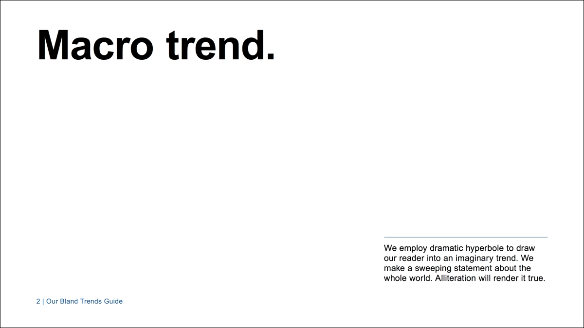 “Bland is the new oil and oil is the old data,” she continues. Disruption is the glue. But what’s driving it? Let me tell you about some innovations we have absolutely nothing to do with: AI, VR, AR, drones, bitcoin. Our proprietary methodology and artificial approach combines every technology ever invented to form a kind of bland machine.”