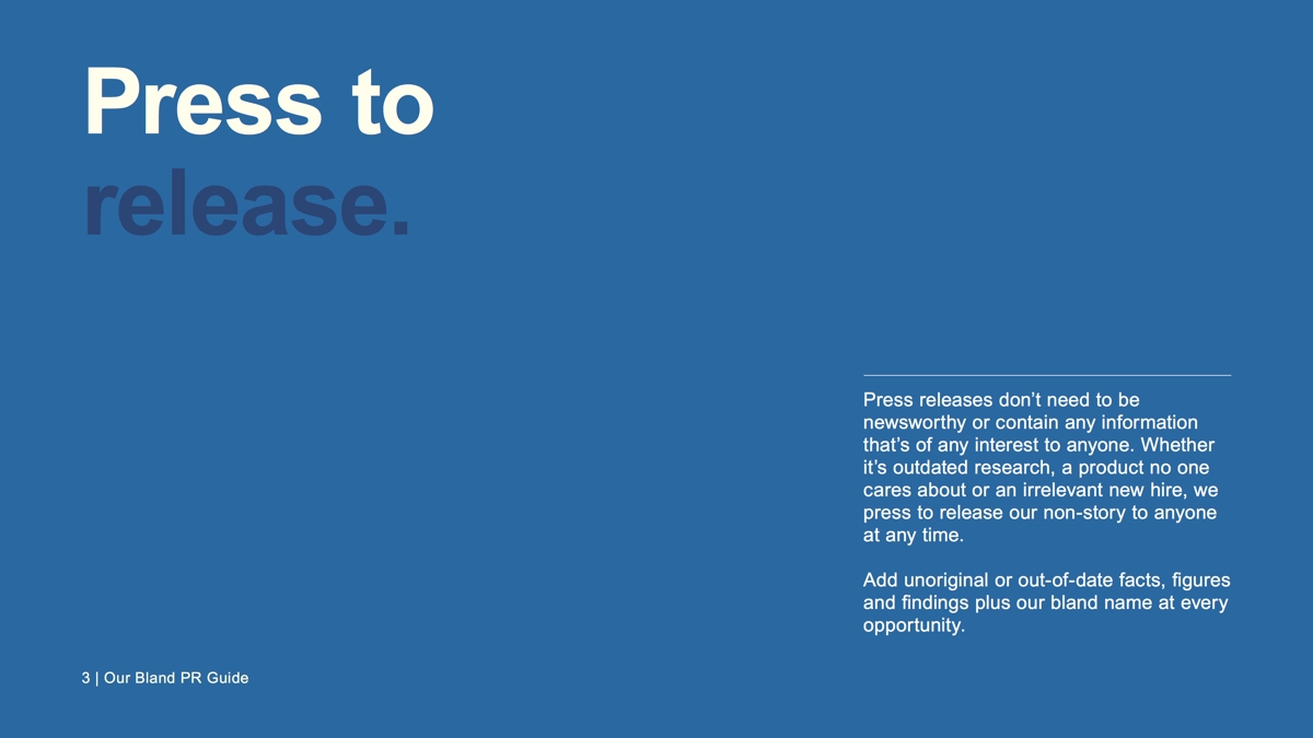 What was originally just a set of guidelines has now developed into a fully fledged website, with contributions from creative industry figures from across the world. And it tackles a long list of misdemeanours including terrible press releases, diabolical briefs and a sarcastic social media guide that takes aim at brands’ reliance on influencers and its lip service approach to diversity.